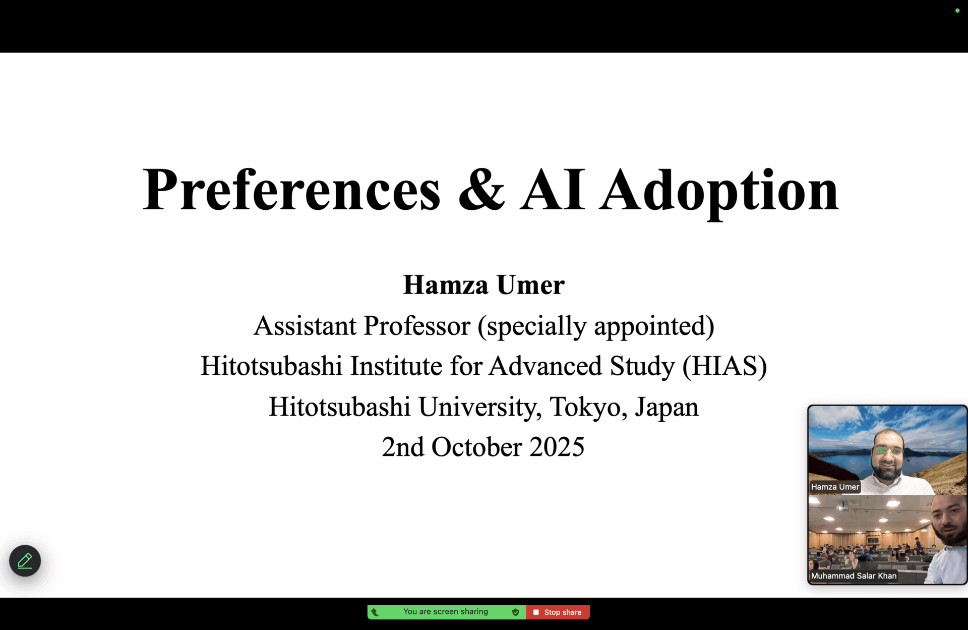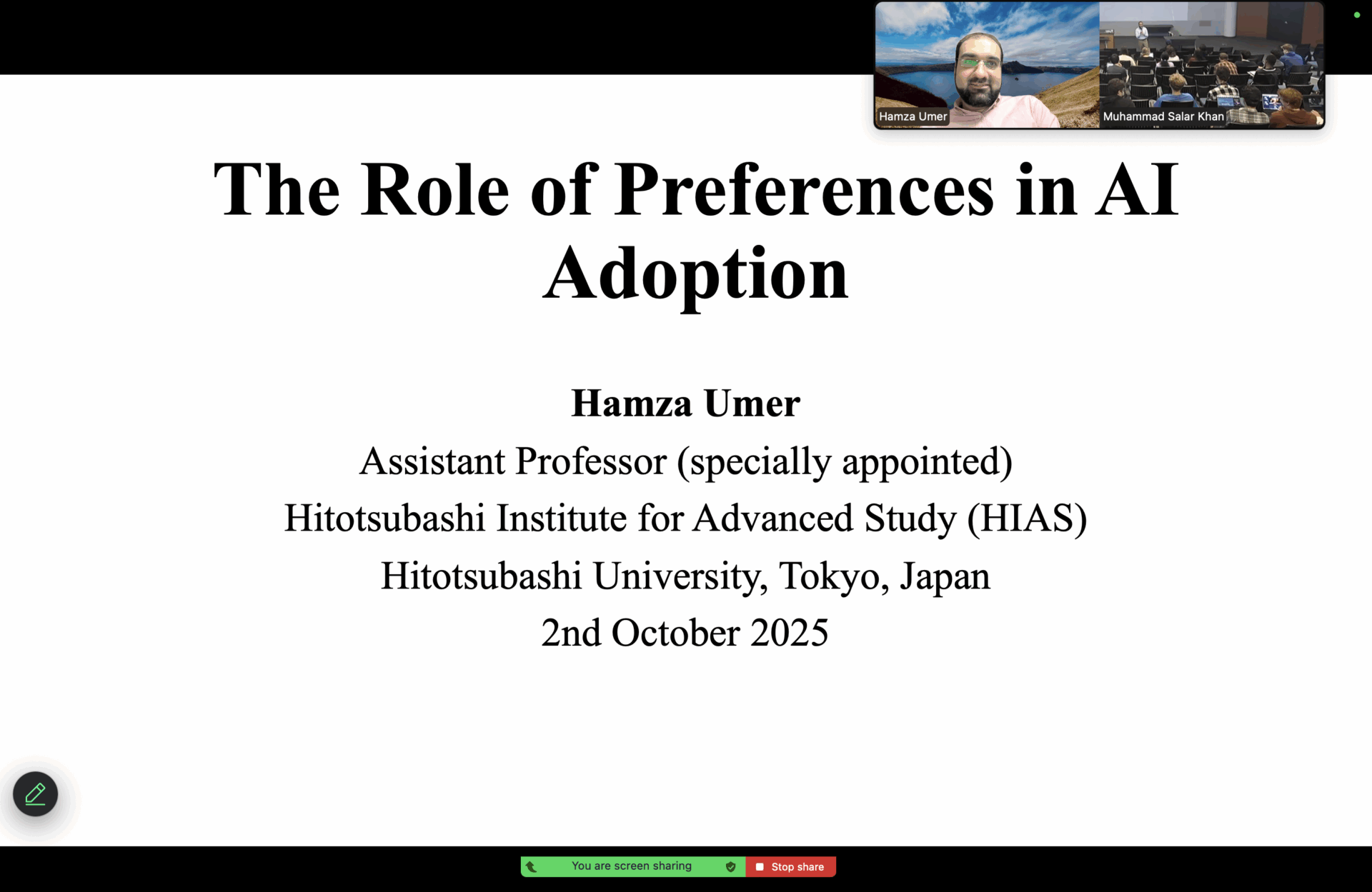Hamza Umer 特任講師が、10月2日に米国ロチェスター工科大学(RIT)のDepartment of Public Policy, College of Liberal Artsの Ethics, Values & Public Policyコースにおいて’The Role of Preferences in AI Adoption’および’Preferences & AI Adoption’と題した2つの招待講義を行いました。