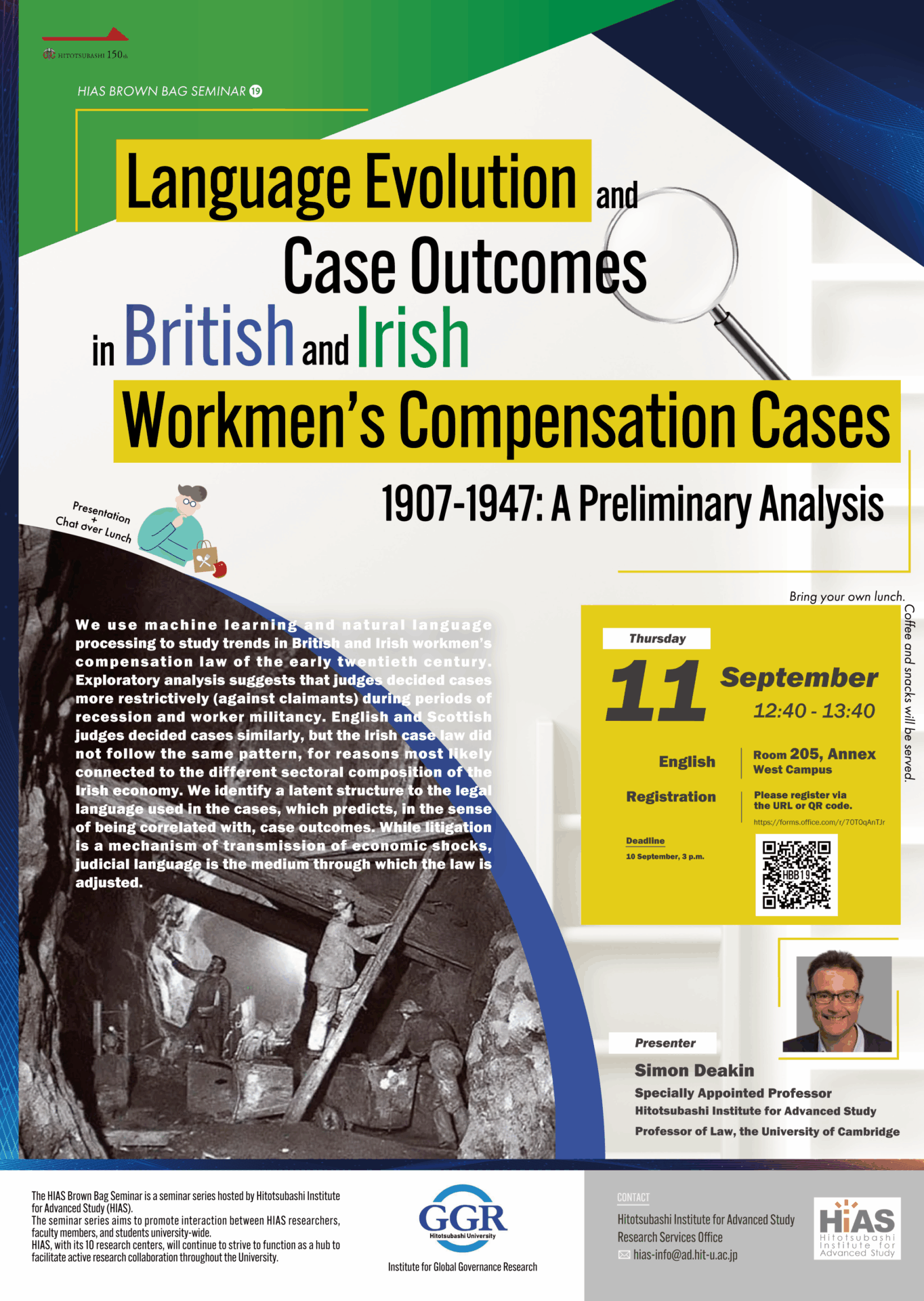 社会科学高等研究院のSimon Deakin特任教授を報告者として、2025年9月11日(木)に第19回HIAS Brown Bag Seminarが開催されました。「Language evolution and case outcomes in British and Irish Workmen’s Compensation cases, 1907-1947: A preliminary analysis」のタイトルで報告が行われ、報告内容について活発な議論が行われました。
