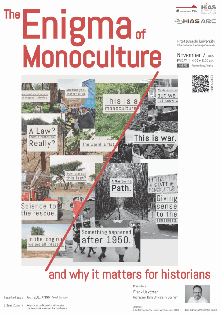 Organized by Jacoby Julia Mariko, Assistant Professor at Hitotsubashi Institute for Advanced Study, the upcoming Hitotsubashi University International Seminar, “The Enigma of Monoculture (and why it matters for historians),” will take place on Friday, November 7, 2025. The event will feature Frank Uekötter, Professor at Ruhr University Bochum, as the presenter.
